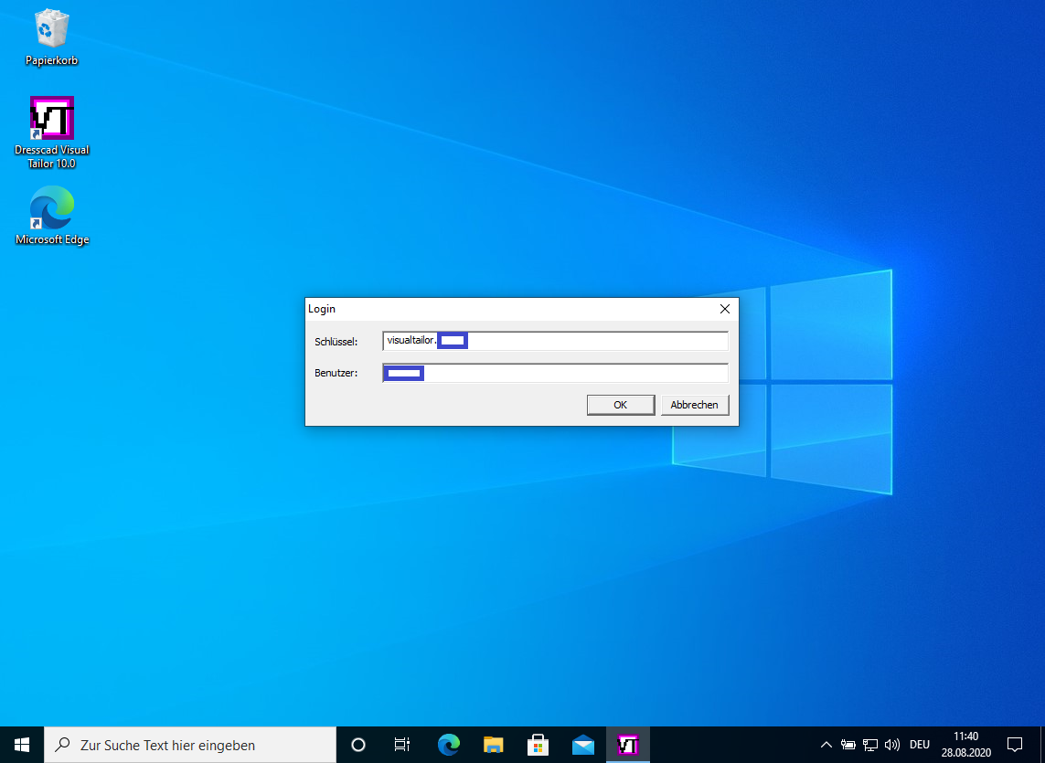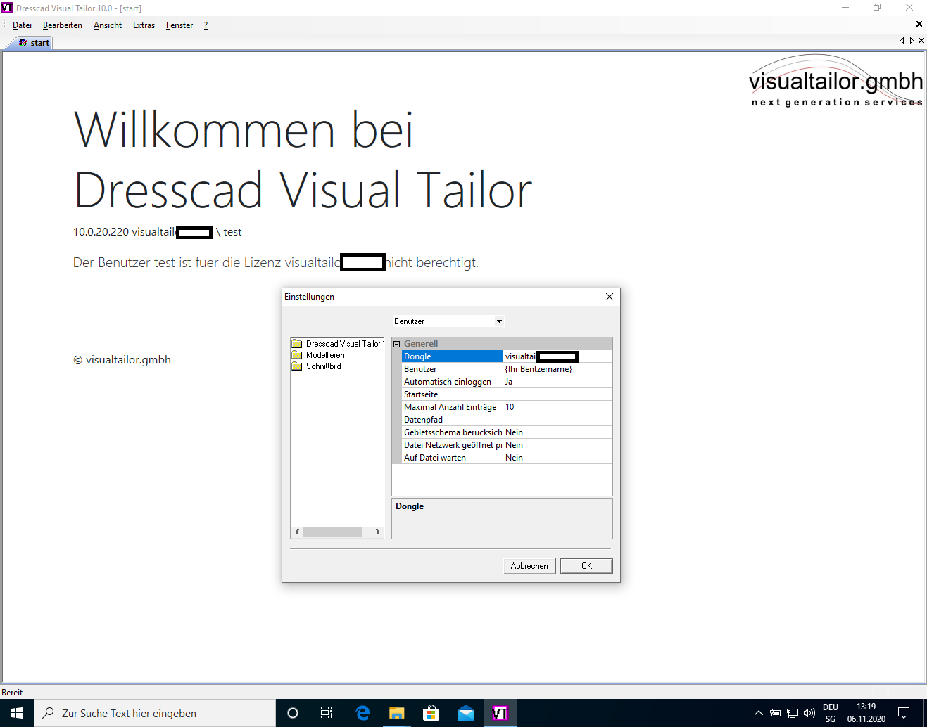 Wenn Sie Dresscad Visual Tailor 10.0 zum ersten Mal starten, erscheint ein Login Dialogfeld mit dem Schlüssel, den Sie bei der Installation eingetragen haben. Wenn der Eintrag leer ist, tragen Sie bitte den Lizenzcode hier ein. Prüfen Sie bitte den Benutzer, dieser muss mit dem an uns gemeldeten und freigeschalteten Benutzer für Ihren Schlüssel übereinstimmen.