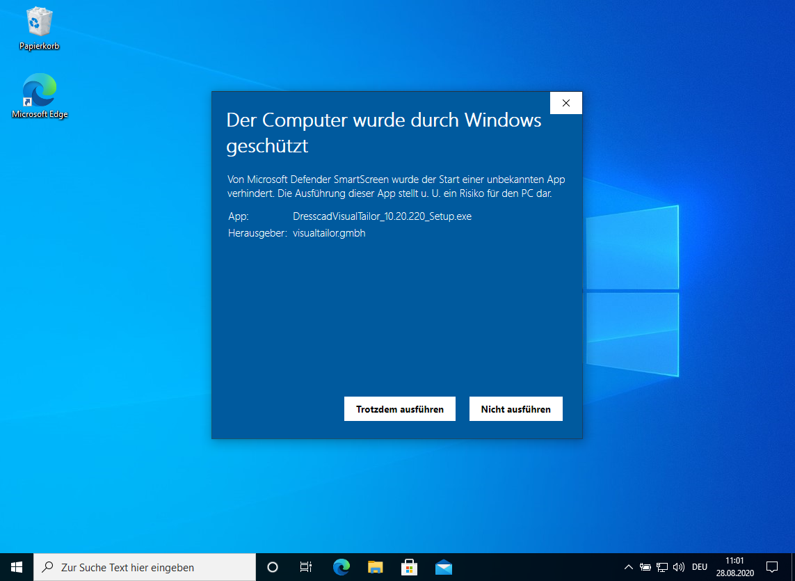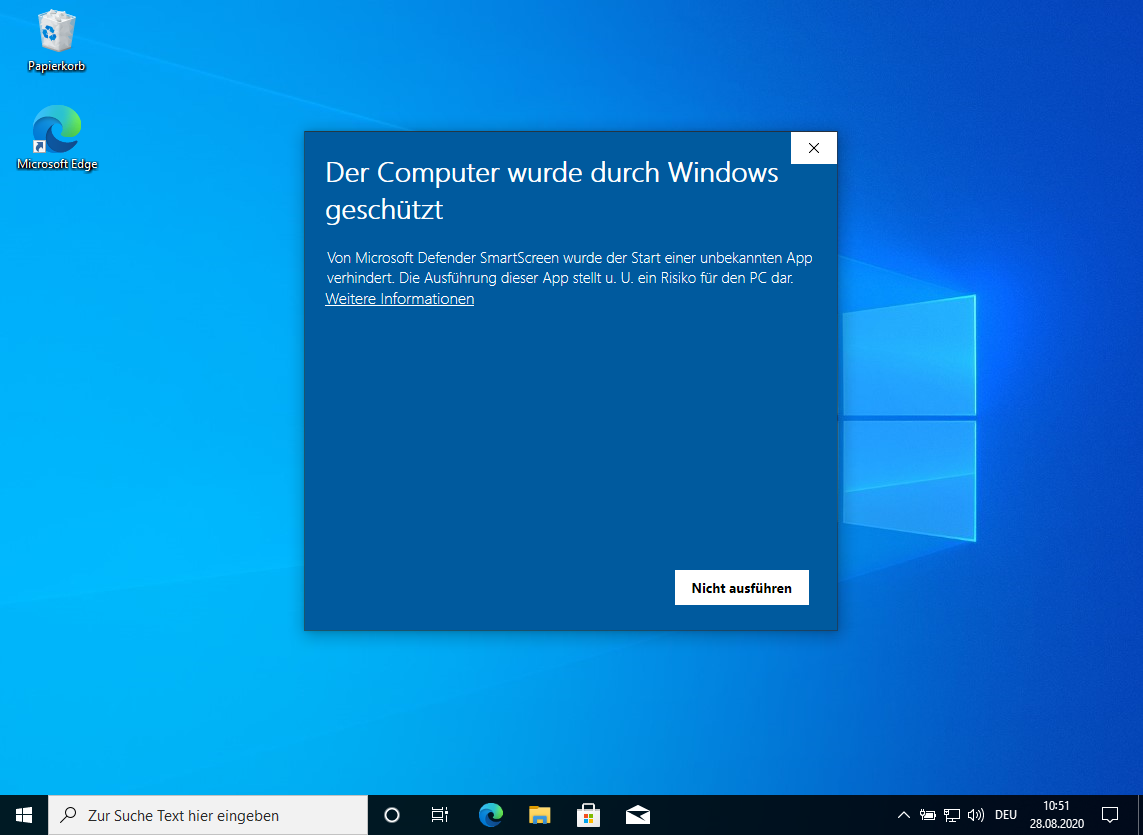 Starten Sie die heruntergeladene Datei durch einen Doppelklick. Wenn Ihr Computer durch Microsoft Defender SmartScreen geschützt wird, wird folgender Dialog angezeigt.